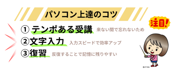 まずパソコンの上達のヒントとして下記3点があげられます。