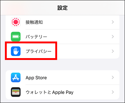 ①ホーム画面の『設定』から『プライバシー』をタップ