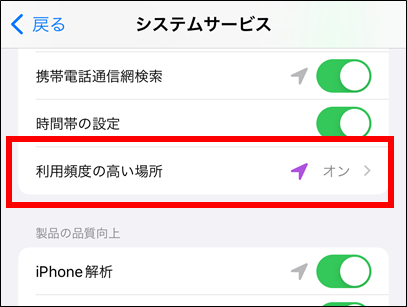 ③『システムサービス』をタップし、『利用頻度の高い場所』をオン