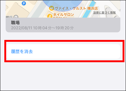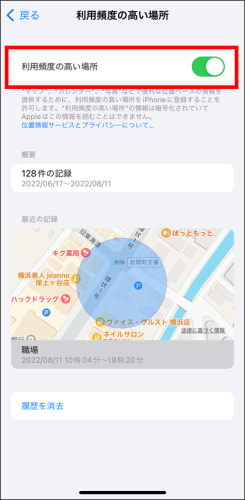 履歴の削除は『利用頻度の高い場所』で『履歴を消去』をタップすると消去できます。