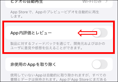 ②『App内評価とレビュー』を左側にスワイプ