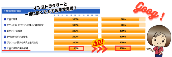全体の点数は若干下がりましたが、先ほどの「文書の共同作業の管理」は満点!